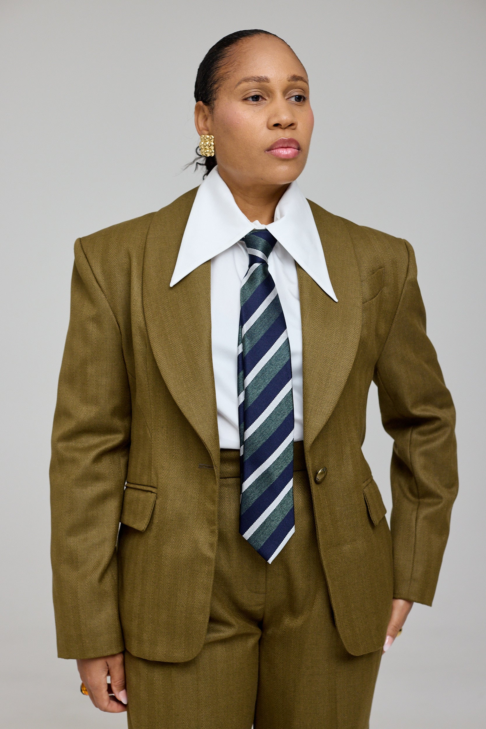 Designed with a tailored fit that cinches at the waist, The Heze Suit Blazer creates an elegant, structured silhouette. Fully lined for comfort, it features a distinctive lapel, enhanced shoulders, hip pockets, and luxurious gold hardware on the front and cuffs — subtle details that set it apart.